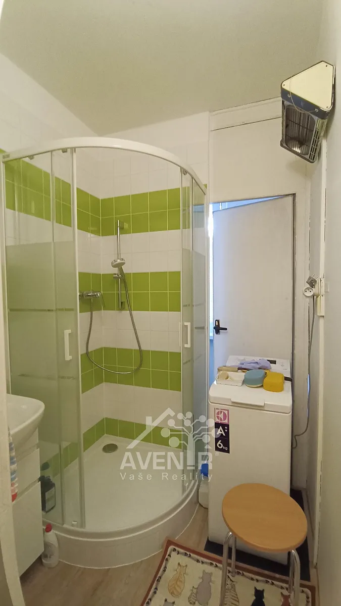 Byt je v původním, udržovaném stavu, částečně upravený. Proběhla vestavba SDK v koupelně do stávajícího nezděného jádra, nové obklady, sprchový kout, umyvadlo a nové lino ve stávajícím jádru. Kuchyňská linka je původní. Lodžie je renovovaná, okna plastová. V bytě jsou nové jističe připravené na budoucí rekonstrukci, část elektroinstalace (cca 4 zásuvky) je již v mědi. V obytných pokojích jsou původní parkety, v chodbě nový koberec a v kuchyni původní lino. Společné prostory domu mají nové, velmi pěkné chodby a nový výtah. Byt působí útulným dojmem. SVJ funguje bez problémů, správcem je Loreta. Na fotografiích chybí jeden pokoj.
