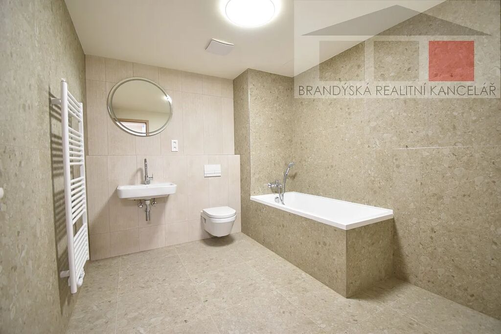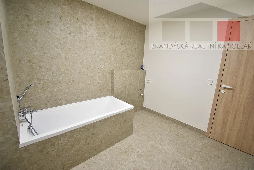 Nabízíme pronájem nadstandartního nového bytu 2+kk s lodžií ve 2. patře Bernardova domu v bytovém projektu Na Mariánské cestě, Brandýs nad Labem. V bytě je prostorný obývací pokoj s kuchyňským koutem (26,4m2) a vstupem na lodžii (8,2m2), ložnice (13,0m2), šatna (5,0m2), chodba (4,7m2), koupelna s WC (8,7m2), samostatné WC (1,7m2). K bytu náleží sklep (2,7m2) a garážové stání v suterénu domu. Kuchyňská linka je ve výrobě a bude kompletně vybavena vestavěnými spotřebiči (indukční varná deska, trouba, digestoř, myčka nádobí, lednice). Byt je úplně nový, dosud neužívaný, orientace na SV. Na všech oknech budou předokenní rolety. Měsíční poplatky pro dvě osoby včetně garážového stání činí 6.100,-Kč + 1.000,-Kč elektřina. Vratná kauce (jistota) 42.000,-Kč, provize RK ve výši jednoho měsíčního nájmu; při podpisu nájemní smlouvy je nutné zaplatit celkem 91.100,-Kč. Žádaná lokalita v blízkosti přírody s dobrou občanskou vybaveností, dojezdová vzdálenost do Prahy ČM cca 20 min.