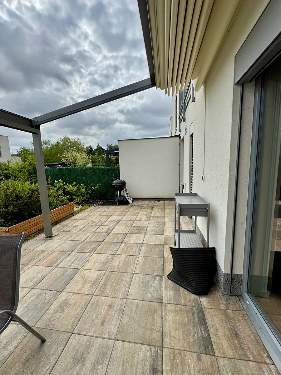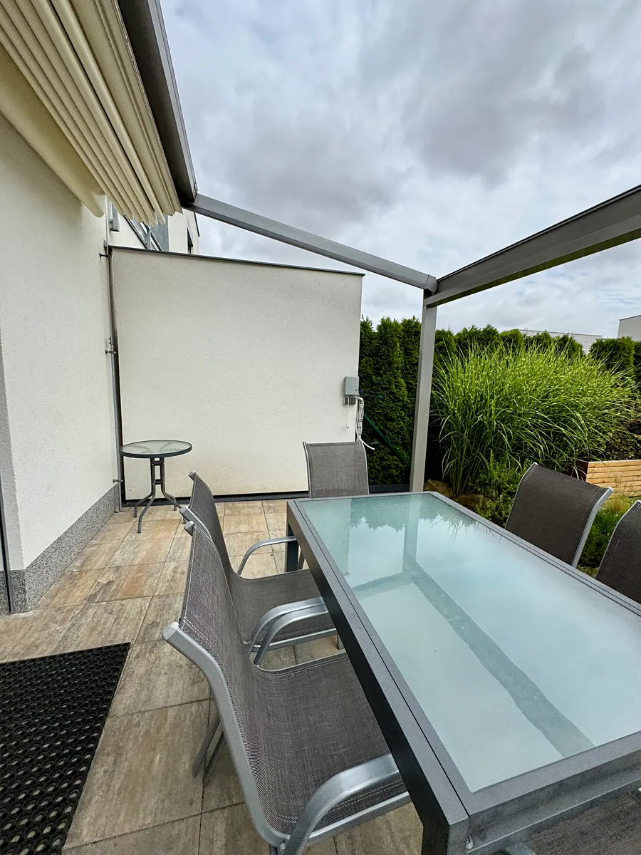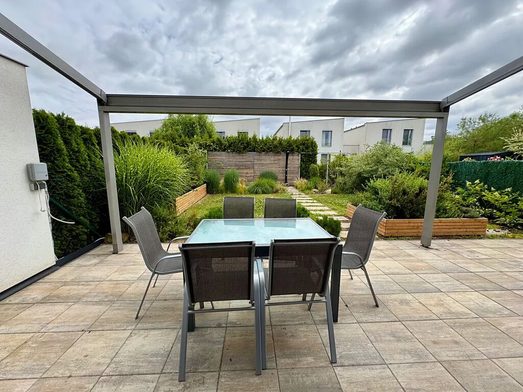 K domu náleží udržovaná zahrada s terasou a venkovním nábytkem, zahradní sprchou, závlahou a pergolou s posuvnou střechou, která umožňuje celoroční využití prostoru. Veškerá okna jsou osazena venkovními žaluziemi, které zajišťují soukromí a efektivní regulaci teploty v domě.
