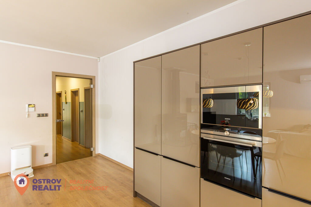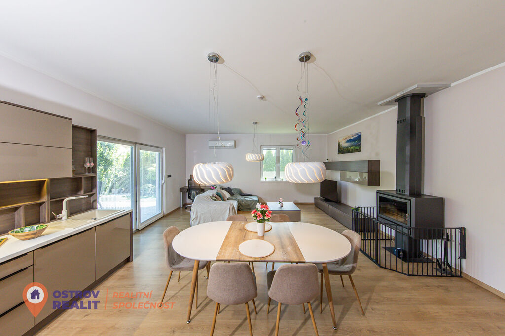 Dominantou interiéru je velkoryse řešený obývací prostor s přímým vstupem na zahradu, kde je dostatek místa pro odpočinek, rodinné chvíle i posezení s přáteli. Kuchyňská část s moderní linkou a vestavnými spotřebiči Siemens tvoří přirozené centrum denního života.