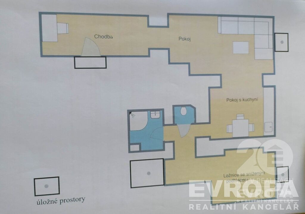 Celý nebytový prostor je citlivě zrekonstruovaný se zachováním původních prvků kamenného a cihlového zdiva. Skládá se ze vstupní prostorné chodby, s místem na psací stůl, skříně atd., dále velká místnost s kuchyňským koutem, průchod do chodbičky, kde je koupelna se sprchou a samostatné wc a dále menší místnost, která má snížený podhled (výška stropu cca 165cm, tato místnost není zahrnutá v uvedené ploše) Na podlahách je praktická dlažba.