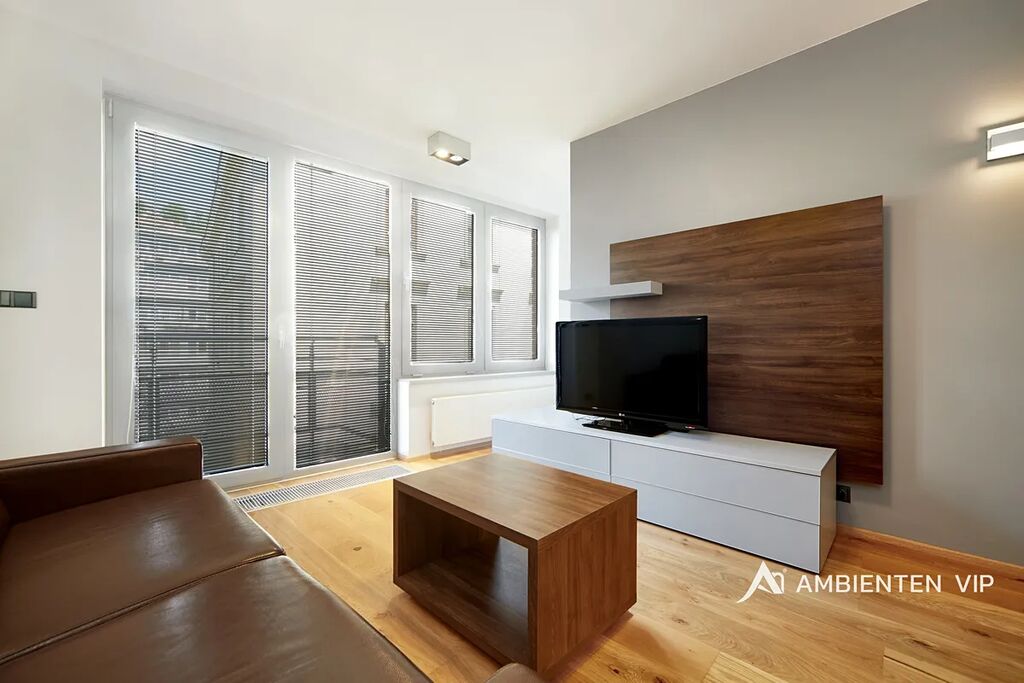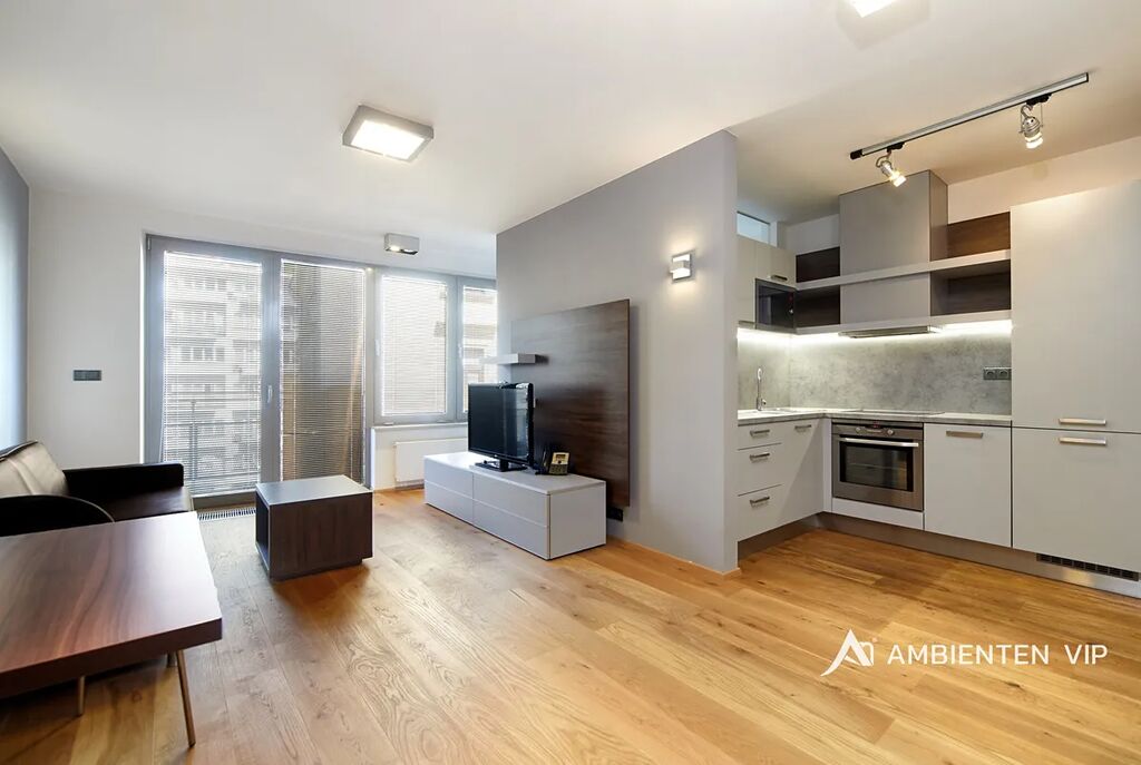 Vybavení bytu: moderní kuchyňská linka na míru s veškerými spotřebiči (varná deska, trouba, digestoř, mikrovlnná trouba, chladnička, myčka nádobí), pračka, vestavěné skříně, postel, obývací stěna, televizor, sedací souprava, konferenční stolek, světla, dřevěné dveře a podlahy.