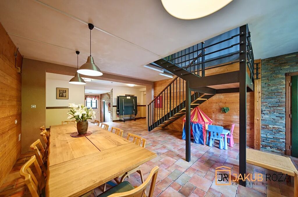 Pro společně strávené chvíle vybízí prostorná hala (společenský prostor) s ping pongem, stolním fotbálkem, dětským koutkem a dále je zde velký stůl ke společnému posezení, večerní zábavě a dětským hrám. V domě je k dispozici lyžárna i sušák na lyžařskou obuv. Dům dále nabízí v přízemí dva samostatné apartmány 2+1 a původní podsklepenou klubovnu, která může být přestavěna na samostatný prostorný apartmán o výměře cca 75 m2, nebo je možné tento prostor propojit s vedlejším apartmánem a vznikne tak veliký apartmán o výměře 124 m2. V této původní části budovy je nově vybudována přípojka vody, připojení k tepelnému čerpadlu a nové napojení na hlavní el. rozvaděč. V podkroví jsou k dispozici další tři apartmány - dva apartmány 2+kk a jeden apartmán 1+kk.