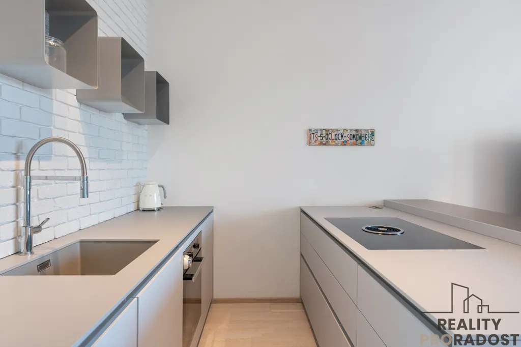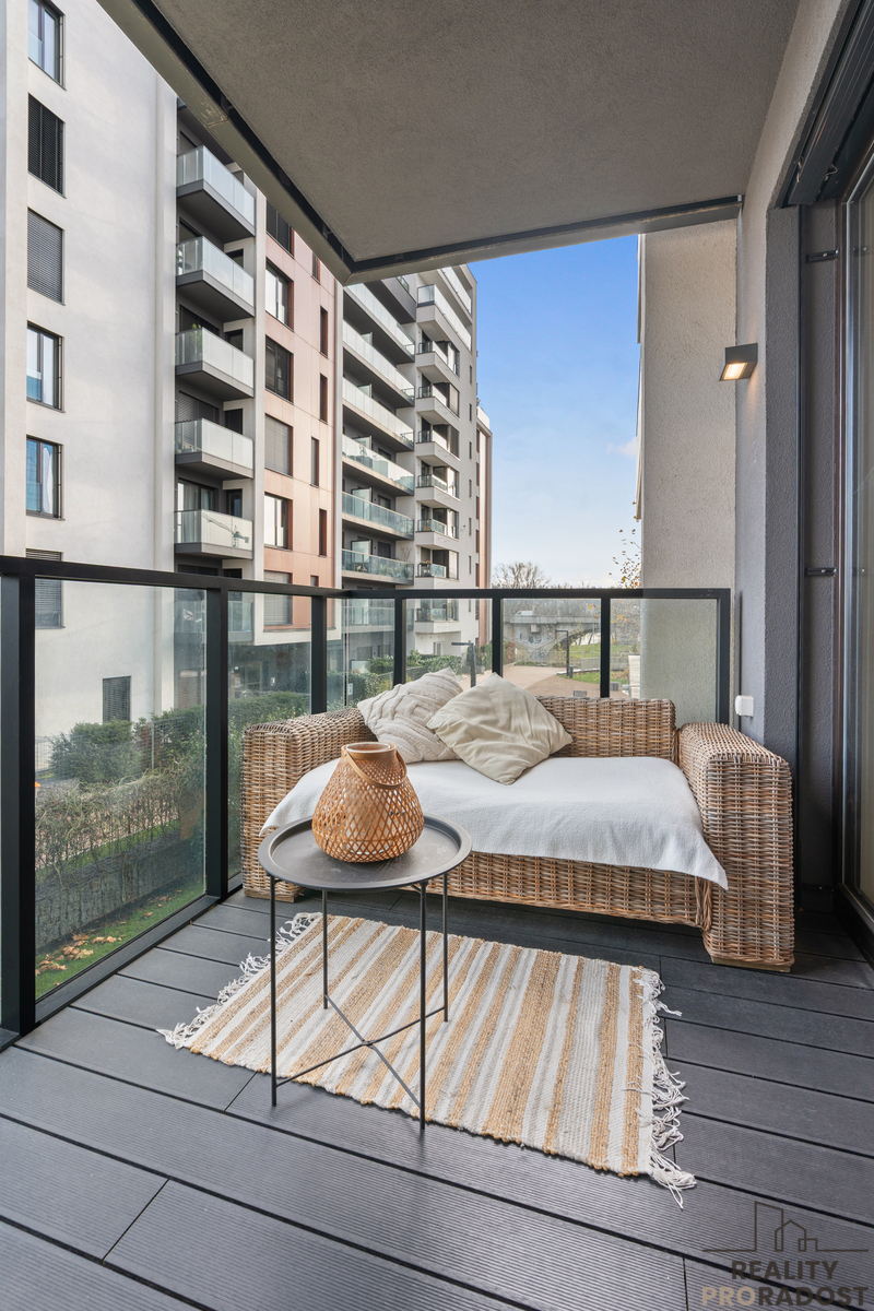 Byt se skládá z prostorné předsíně, světlého obývacího pokoje s designovou kuchyňskou linkou vybavenou moderními spotřebiči (indukční deska s integrovaným odsáváním BORA, trouba Miele, myčka nádobí, lednice Smeg), ložnice s velkou vestavěnou skříní, koupelny s vanou a toaletou, komory s pračkou a sušičkou a balkónu, ze kterého se otevírá krásný výhled na Vltavu.