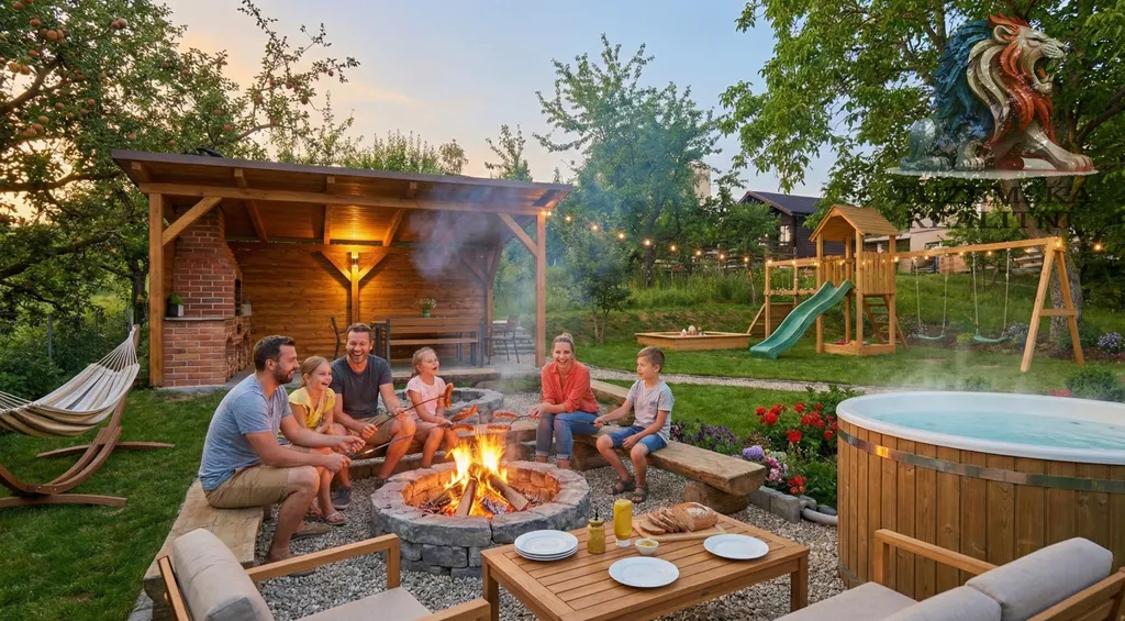 Vize soukromého wellness: Pod korunami stávajících ořešáků je ideální místo pro koupací sud s topeništěm. Večer se naložíte do horké vody a pod hvězdami si užijete ticho, které v paneláku nenajdete.