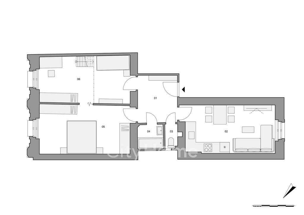 Současná dispozice zahrnuje prostornou vstupní chodbu, dva neprůchozí pokoje s orientací do ulice Horní a samostatnou kuchyni s okny do tichého vnitrobloku, koupelnu a oddělenou toaletu. Díky neprůchozím místnostem je byt vhodný jak pro rodinné bydlení, tak i například na spolubydlení nebo jako investiční příležitost.