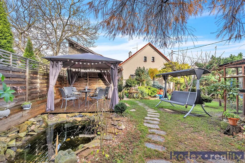 Parkování - garáž a v ulici před domem. Zahrada s jezírkem, dvě terasy, venkovní sklad a studna s užitkovou vodou.