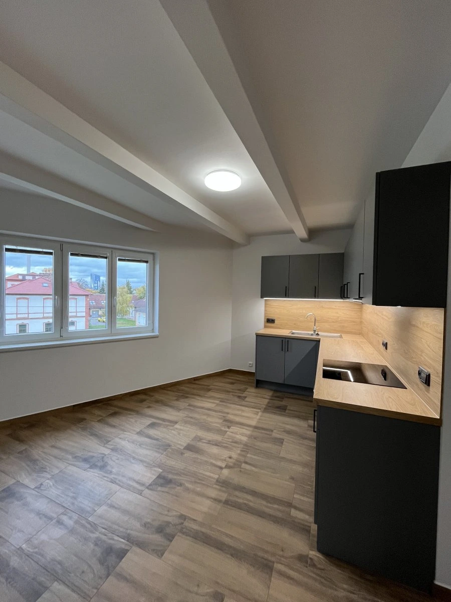 Dominantou bytu je velká kuchyňská linka s vestavěnými spotřebiči (trouba, varná indukční deska, digestoř) s výhledem do zeleně a velmi dobře prosvětlený obytný prostor, nabízí dostatek místa pro jídelní stůl se židlemi.