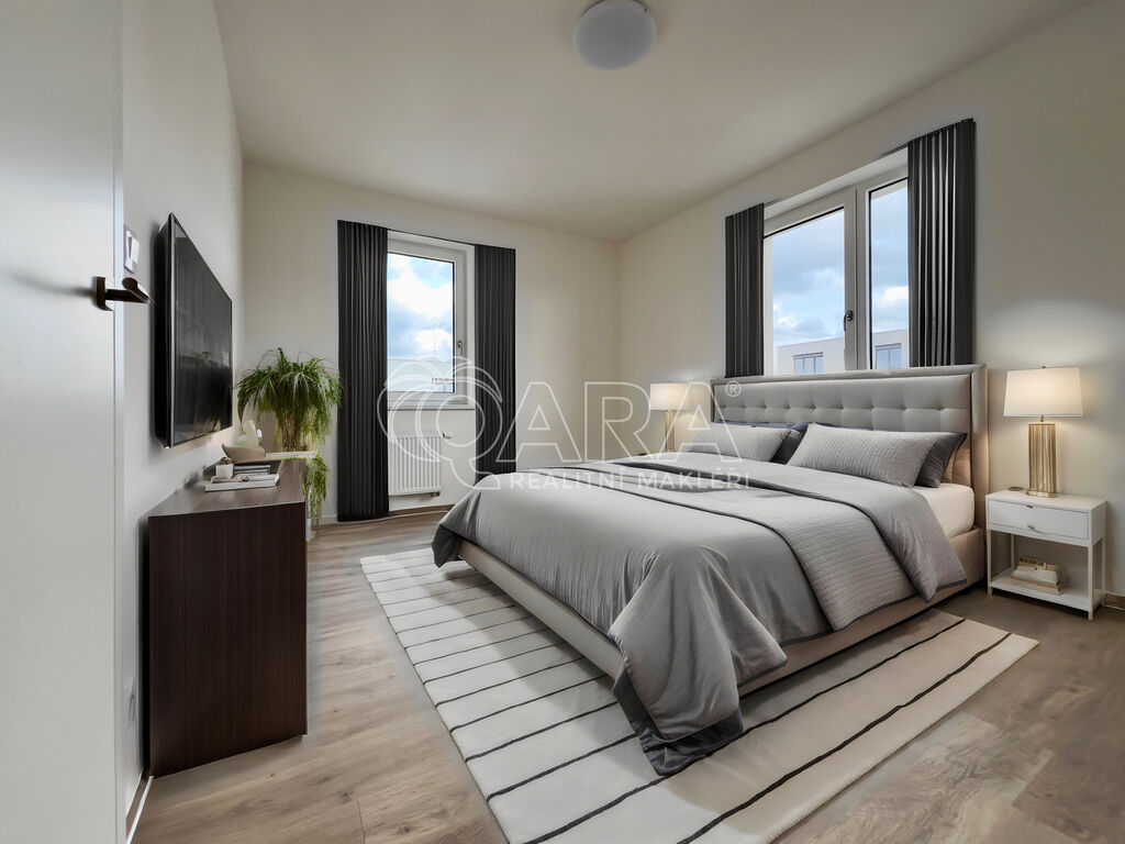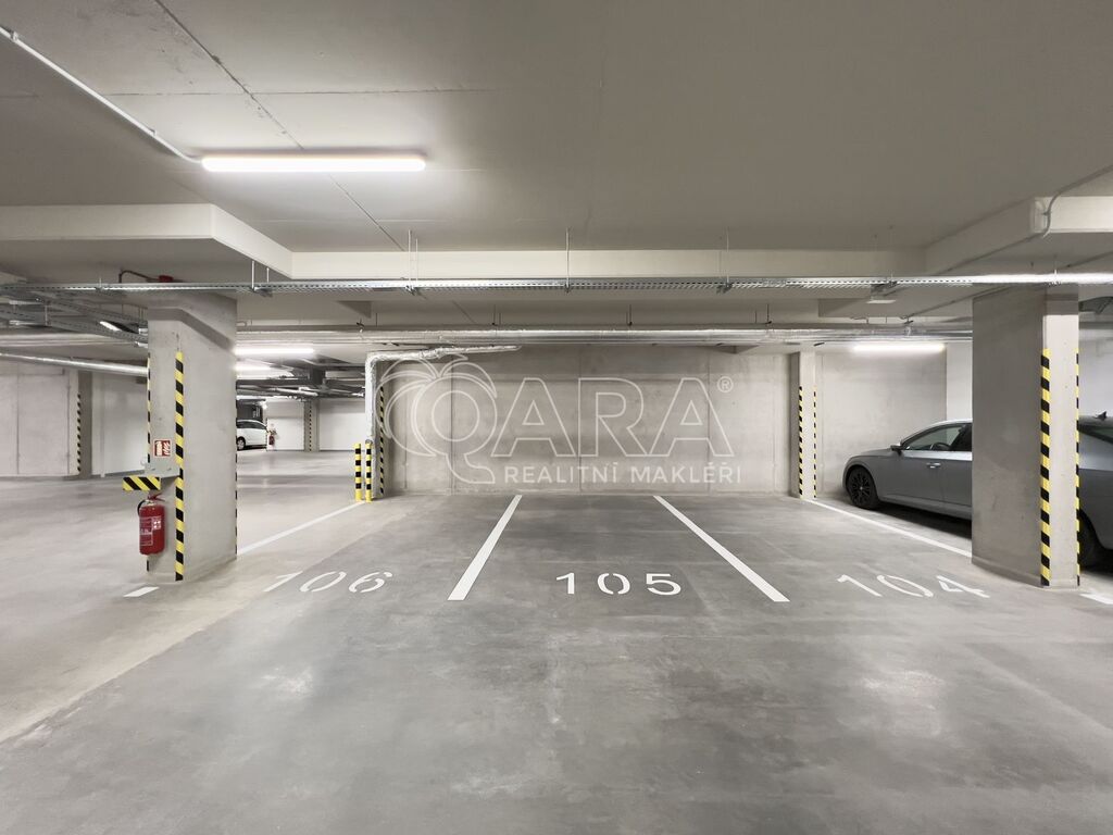 Bytová jednotka o výměře 76,8 m² se nachází v 1. nadzemním podlaží (zvýšené přízemí) novostavby z konce roku 2023 (dva výtahy jsou samozřejmostí). Byt se skládá z předsíně o výměře 8,4 m², ze které se dostaneme do kuchyně spojené s jídelnou a obývacím pokojem o výměře 26,9 m², která je zařízena kuchyňskou linkou s elektrickou troubou, čtyřplotýnkovou indukční varnou deskou a digestoří (další spotřebiče nebudou součástí nájmu). Z kuchyně je přístupný balkon o výměře 4,5 m². Se vstupem z předsíně jsou přístupné dva vzájemně neprůchozí pokoje o výměře 12,6 a 13,6 m². Koupelna je přístupná také z předsíně a je vybavena vanou, umyvadlem, skříňkou se zrcadlem a přípojkou na pračku. Dostatek místa na sušičku je samozřejmostí. WC je samostatně. Byt se pronajímá jako nezařízený, tudíž si jej můžete vybavit podle svých vlastních představ. Součástí je i samostatný zděný sklep o výměře 1,4 metrů čtverečních. K dispozici je garážové parkovací stání pro jedno auto (není podmínkou nájmu).