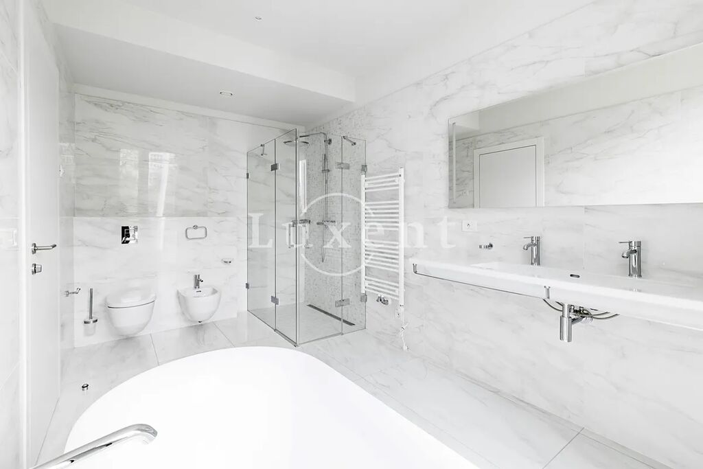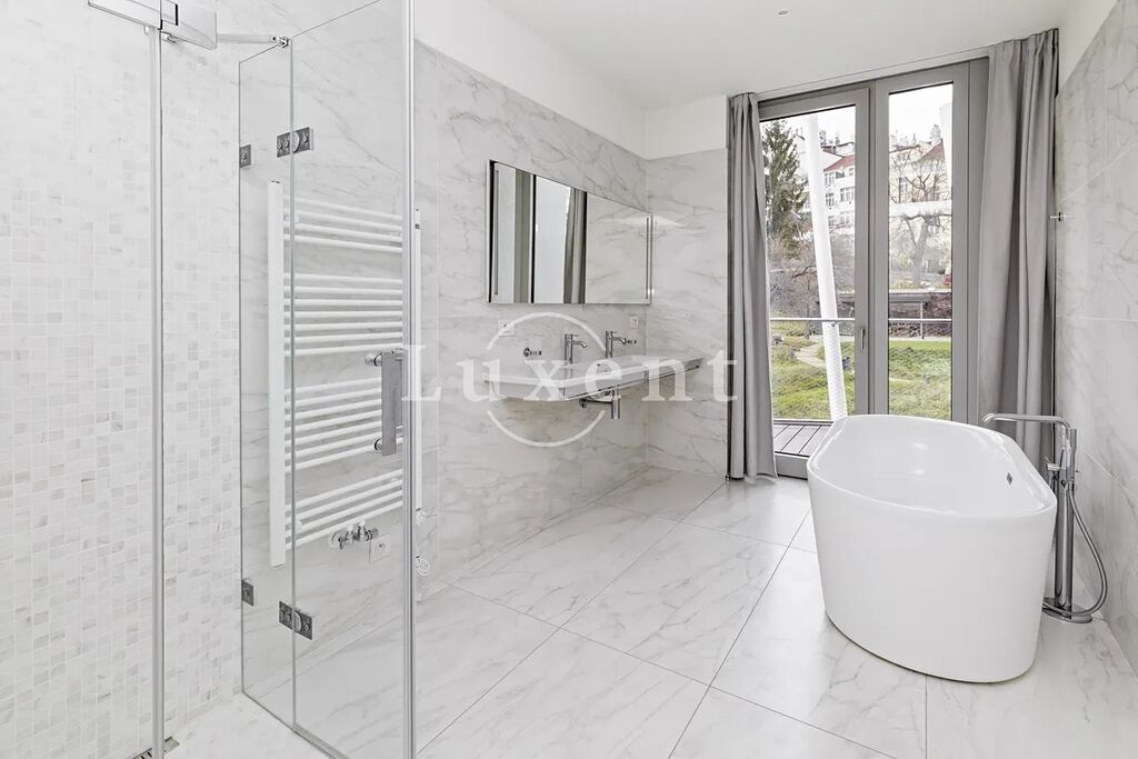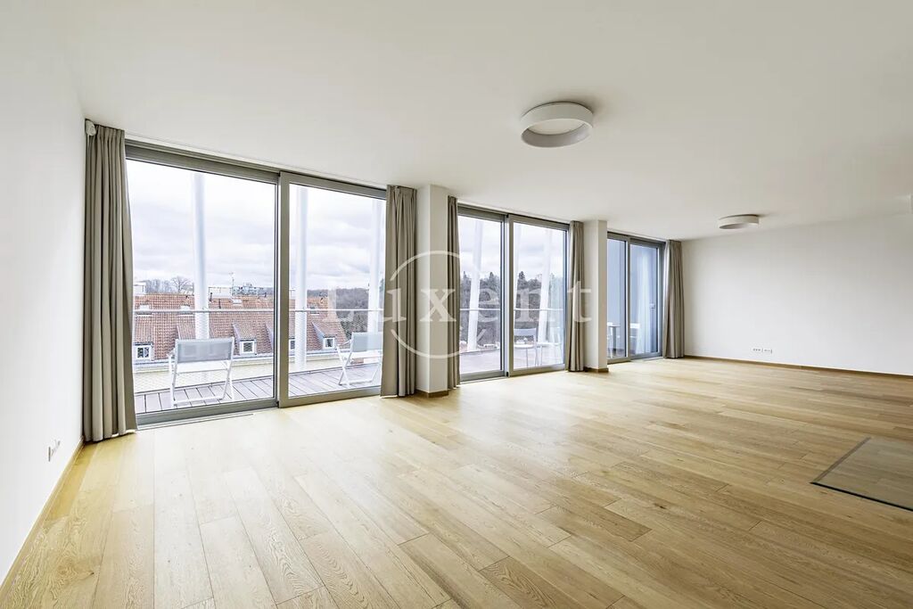 Nabízíme k pronájmu prostorný mezonetový penthouse 4+kk o užitné ploše 212 m² se třemi terasami v 6. a 7. patře novostavby rezidenčního projektu s výtahem a množstvím nadstandardních doplňkových služeb jako je recepce, bazén, wellness a rozlehlá společná zahrada v uzavřeném vnitrobloku. K bytu náleží sklep a za příplatek lze pronajmout parkovací stání v podzemních garážích.