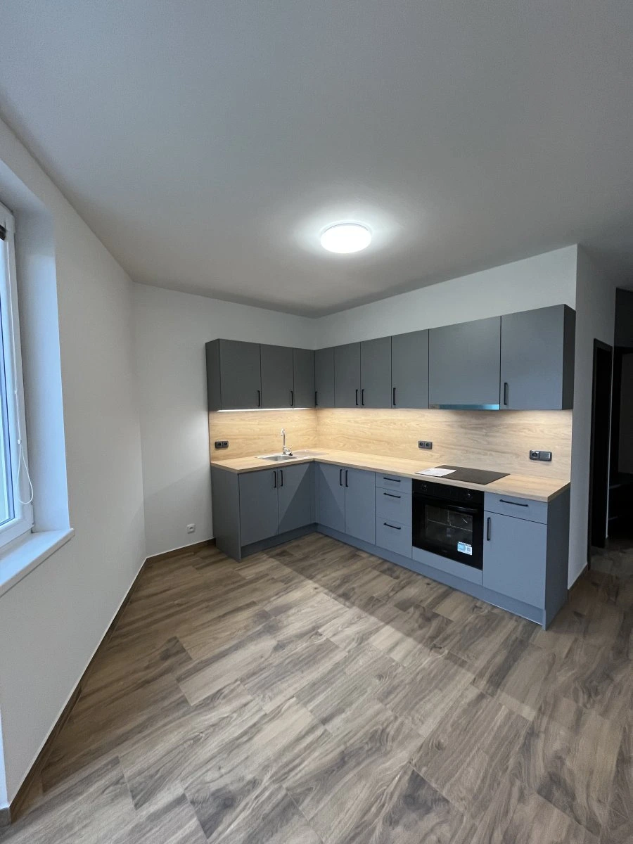 Dominantou bytu je velká kuchyňská linka s vestavěnými spotřebiči (trouba, varná indukční deska, digestoř) s výhledem do zeleně a velmi dobře prosvětlený obytný prostor, nabízí dostatek místa pro jídelní stůl se židlemi.