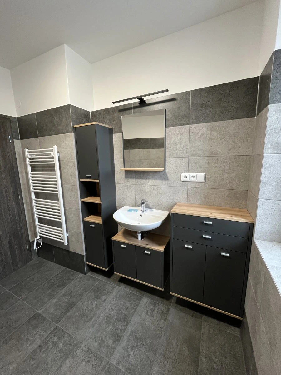Při vstupu do bytu uvidíte prostornou chodbu s úložným prostorem a vstupy do jednotlivých místností. Dispozice nabízí velkou koupelnu s umyvadlem, sprchovým koutem, místem pro pračku se sušičkou a toaletu.