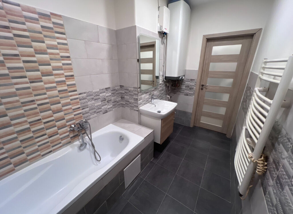 Byt nabízí praktické řešení, které zahrnuje obývací pokoj s kuchyňskou linkou, prostornou ložnici, koupelnu s vanou a WC a komoru. Všechny místnosti jsou světlé a nabízejí dostatek prostoru pro pohodlné bydlení. K bytu náleží sklepní kóje v suterénu domu – praktický úložný prostor