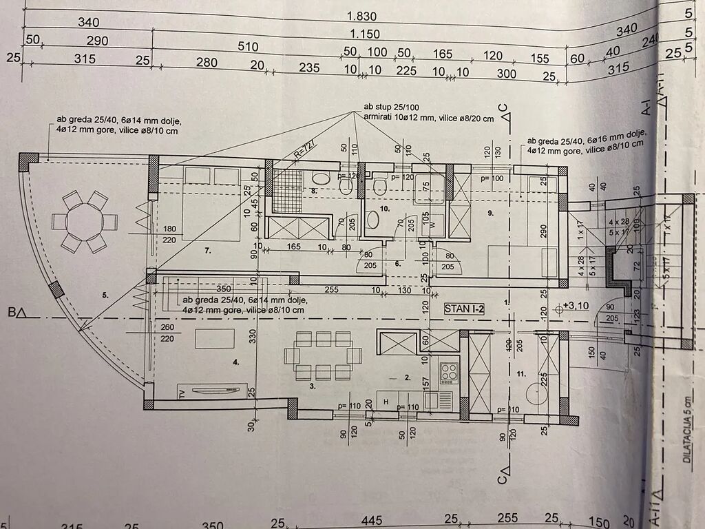Třípodlažní dům disponuje třemi samostatnými apartmány. V prvním podlaží se nachází technická místnost a apartmán č. 1 o rozloze 80 m2 , který má 2 koupelny, 2 ložnice, obývací pokoj s kuchyní a jídelním koutem s přístupem na terasu a společnou zahradu (pro všechny 3 apartmány) kde lze relaxovat ve stínu slunečníků, osvěžit se zahradní sprchou, pobavit se s přáteli chráněni stínem pergoly nebo si připravit výborné jídlo na grilu. Apartmán č 2. o rozloze 85 m2 se nachází v 1. patře a naleznete zde 2 koupelny, 3 ložnice, obývací pokoj s kuchyní a jídelním koutem s přístupem na terasu. Ve 2. patře je umístěný apartmán č. 3 o rozloze 75 m2 a ten má 1 koupelnu, 2 ložnice, obývací pokoj s kuchyní a jídelním koutem s přístupem na terasu. Terasy jsou prostorné a ze všech je překrásný výhled na moře.