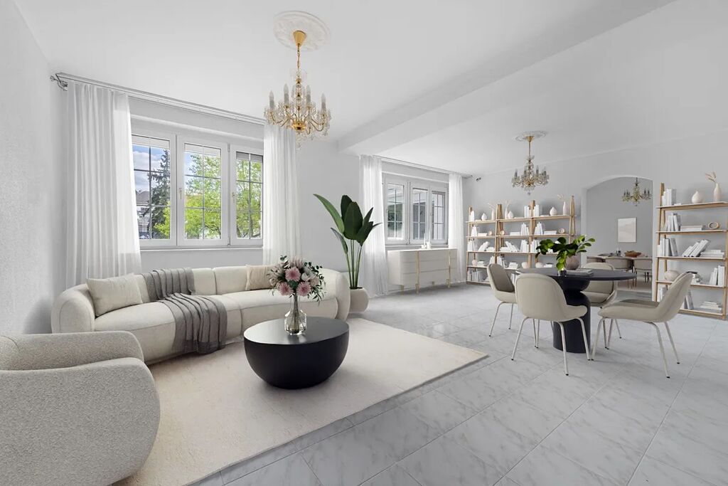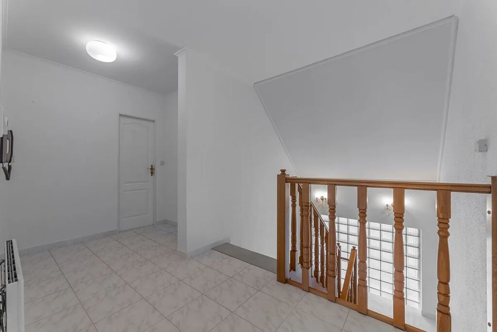 Přízemí: Prostorný obývací pokoj, jídelna, kuchyň, spíž, zimní zahrada s přímým vstupem na terasu, koupelna a technická místnost. Podlahy tvoří praktická dlažba v šedobílém provedení.
