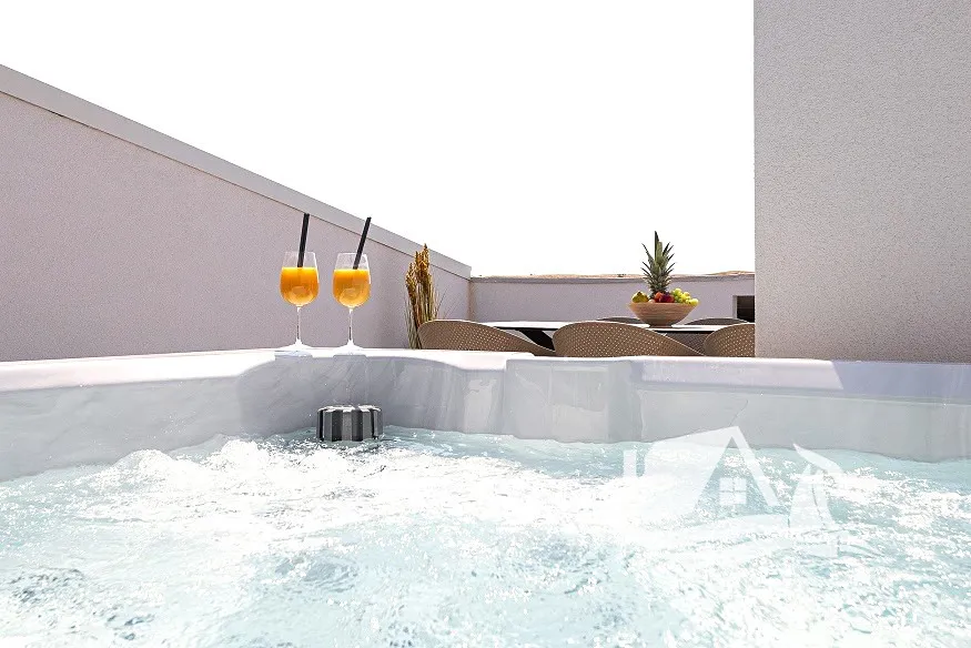 Největší předností apartmánu je bezesporu privátní střešní terasa, která nabízí nejen nádherný výhled na mořský horizont, ale i exkluzivní vířivku – jacuzzi. Tento prostor je ideálním místem pro odpočinek, soukromé chvíle klidu nebo posezení s přáteli při západu slunce. Terasa je navržena tak, aby poskytovala maximální soukromí a komfort bez ohledu na roční období.