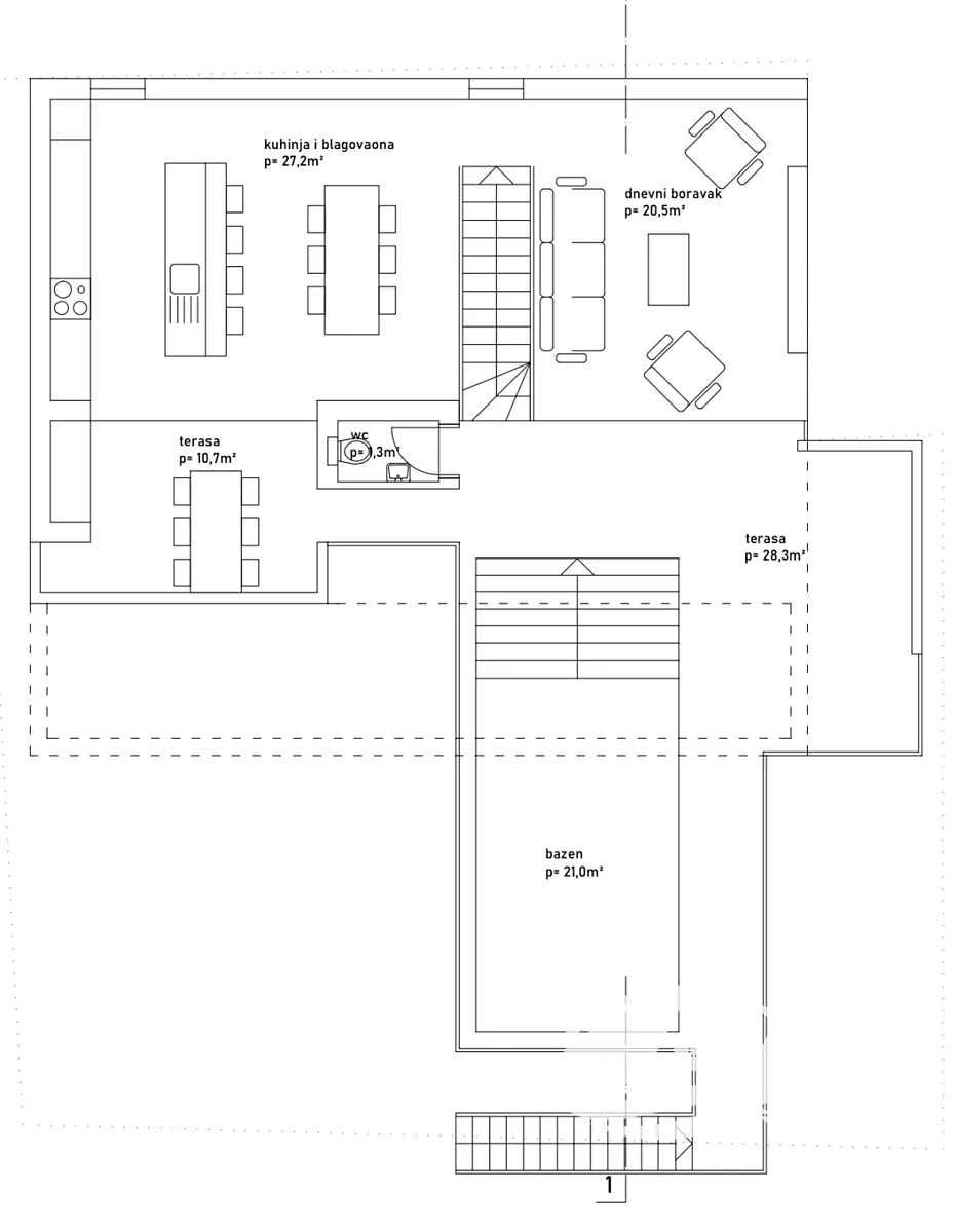 První patro: Obývací pokoj s přístupem na terasu, kuchyň s jídelnou, terasa s bazénem a venkovní gril