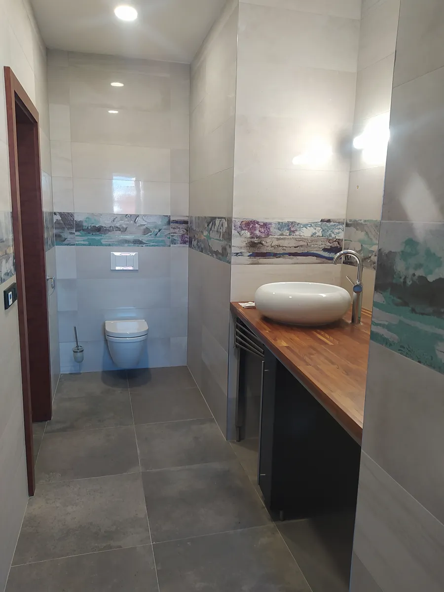 Pokoje 35m² a 22,5m² oddělené na zakázku vyráběnými masivními vestavěnými skříněmi a posuvnými dveřmi, kuchyně 10m², předsíň 8m², koupelna s WC 9,2m², spíž, komora.