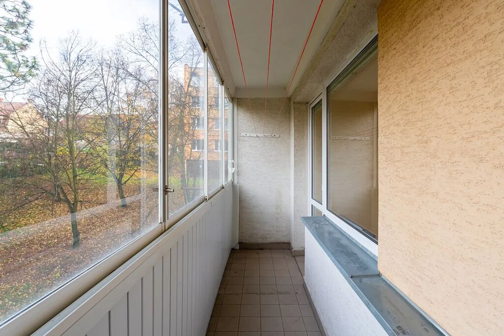 Byt tvoří vstupní chodba, obývací pokoj s kuchyňským koutem a přímým vstupem na zasklenou lodžii, samostatná ložnice a koupelna s vanou a toaletou. K bytu náleží také sklepní kóje.