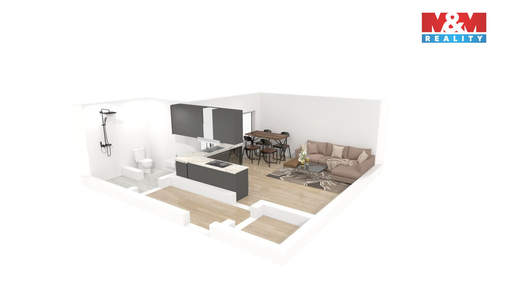 Při vstupu do bytu předsíň, komora, koupelna se sprchovým koutem a WC, kuchyňský kout s obývacím pokojem. Byt napojen na elektřinu a o vytápění bytu se stará elektrický kotel, ohřev vody bojler. V bytě dlažba, plovoucí podlaha, nová plastová okna. Okna jsou situována do vnitrobloku. Ve městě veškerá občanská vybavenost jako škola, školka, pošta a dostupnost MHD přímo před domem.