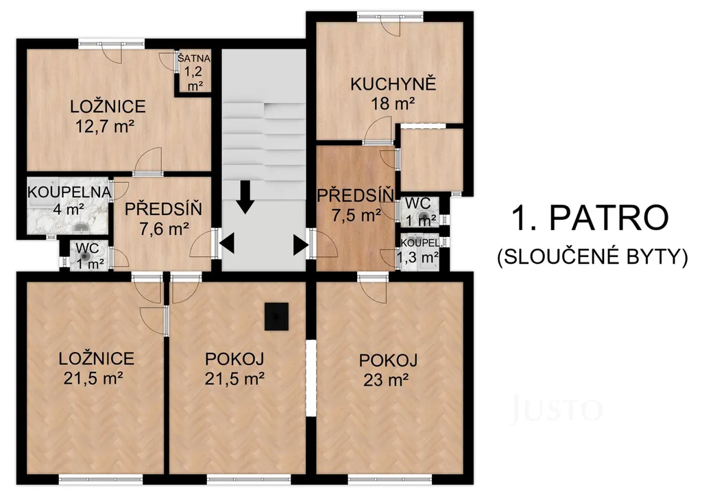 V prvním patře vznikl spojením dvou menších bytů mimořádně prostorný byt 5+kk s balkonem o velikosti 120 m², který zaujme svou vzdušností, dispozičním řešením i příjemnou atmosférou.
