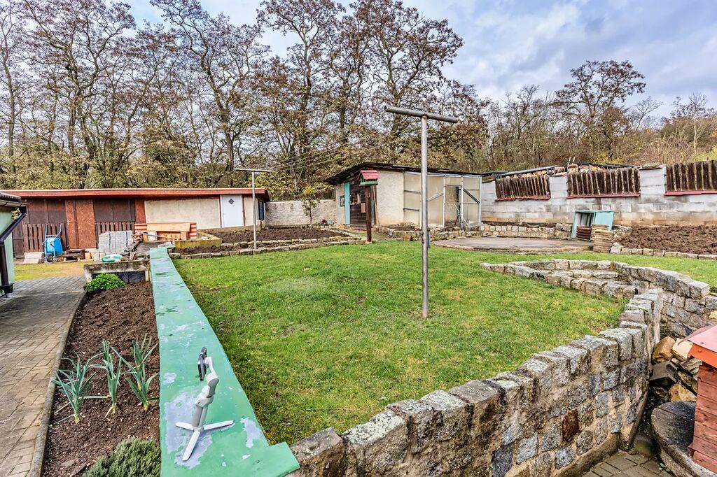 Pozemek má celkovou plochu 732m2 a nachází se na něm mimo domu ještě dvě kůlny, které slouží jako úložný prostor pro zahradní nářadí a v jedné z nich je vybudována další společenská místnost. Pozemek je převážně travnatý s prostory pro pěstování zeleniny. Pozemek je přístupná ze dvou stran. Z jedné pro pěší a z druhé pro vjezd vozidlem. Na pozemku se nachází také vlastní studna s pitnou vodou.