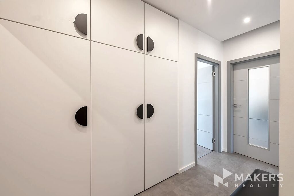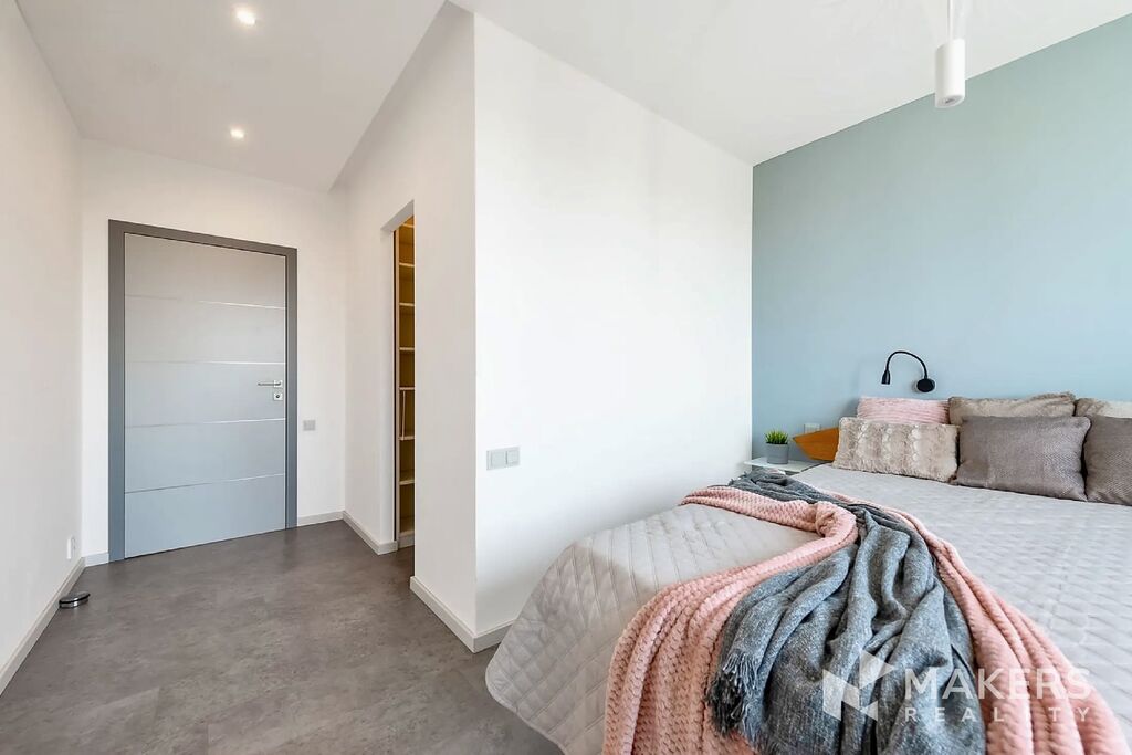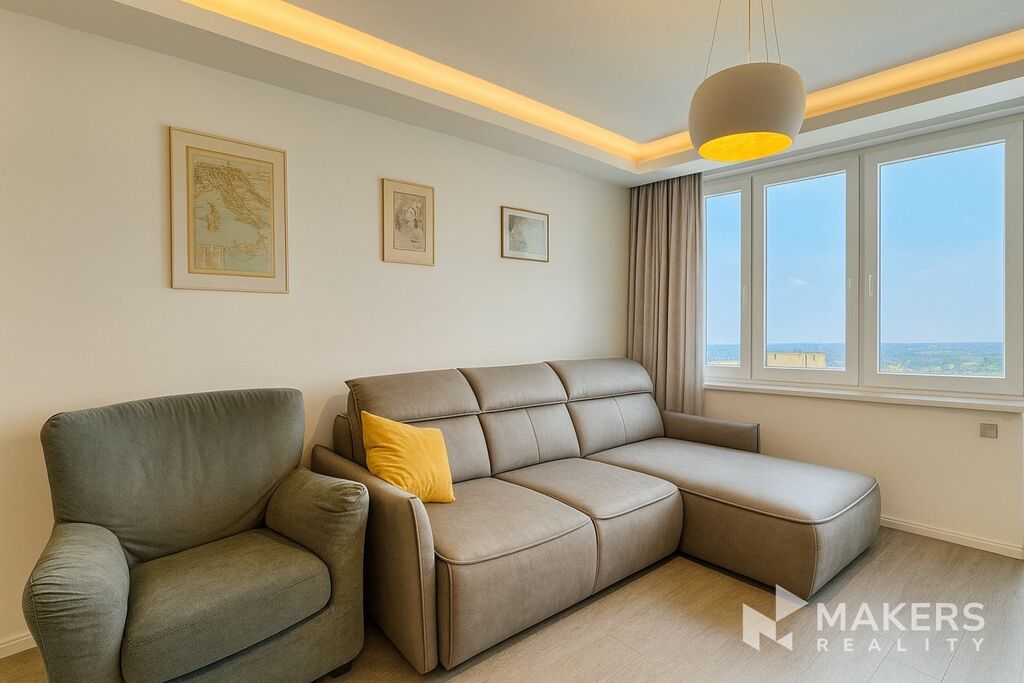 Dispozice bytu zahrnuje obývací pokoj s lodžií orientovanou na západ, ideální pro večerní posezení, dále novou sedací soupravu s elektrickým výsuvem, která může sloužit i pro příležitostné spaní, hlavní ložnici s vlastní walk-in šatnou a druhou ložnici či pracovnu orientovanou na severovýchod – ideální pro práci z domova.