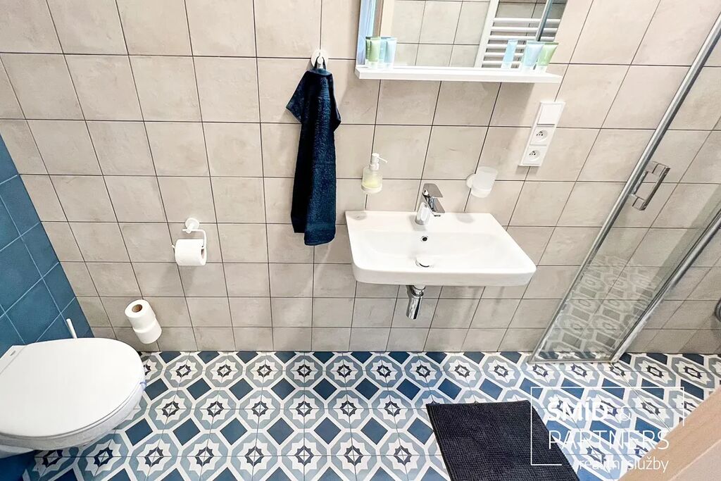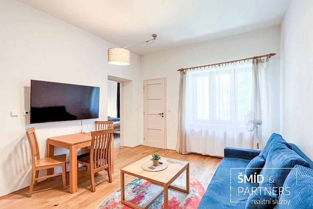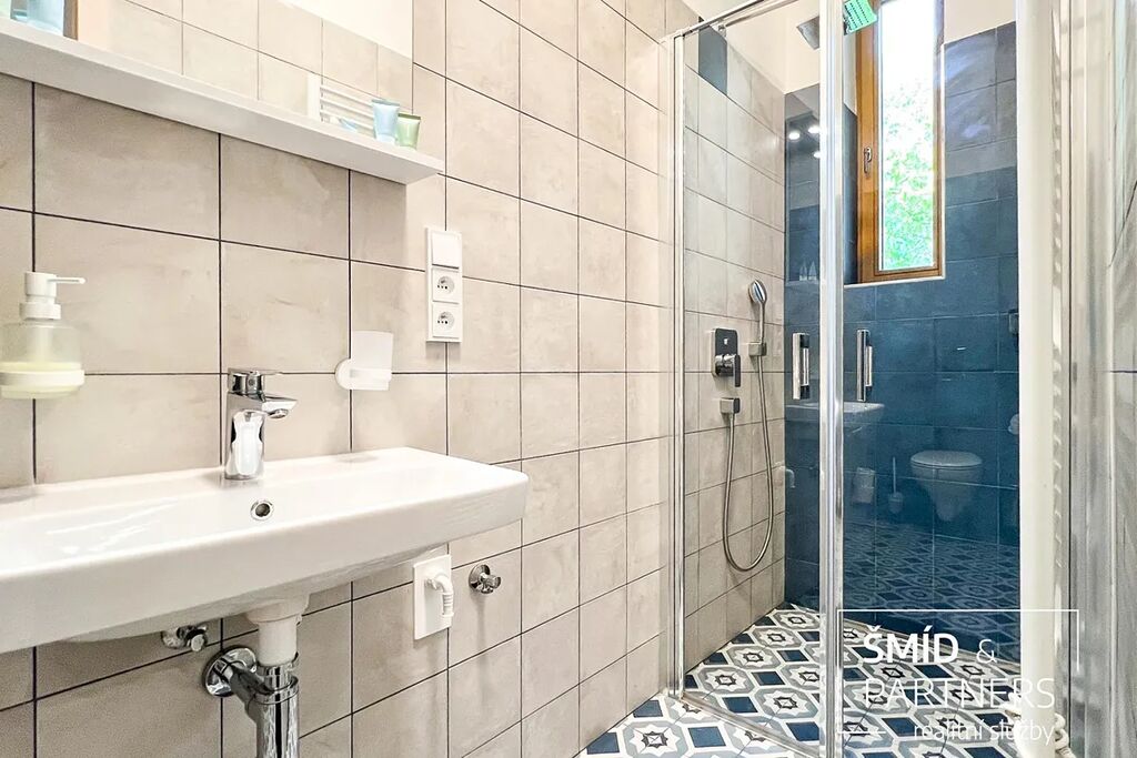 Kompletní rekonstrukce domu proběhla před dvěma lety, nově vznikly tři byty, ateliér, kanceláře a sauna. Byt je díky velkým Eurooknům a světlému interiéru příjemně prosluněný. Výhled do zahrady, která je stejně jako sauna k dispozici všem vlastníkům jednotek, je příjemným výhledem do zeleně. Byt je prostorný a je zde jasně vidět spolupráce s architektkou, vznikl velice vkusný a praktický byt, s obývacím pokojem a kuchyní, ložnice, koupelna s WC a komora. Kuchyň je vybavena troubou, mikrovlnou troubou, lednicí, myčkou a indukcí. Nejčastěji používaný materiál je zde dřevo, vč. podlahové krytiny, díky tomu působí byt příjemným a teplým dojmem. V ložnici je položený koberec. Celkově byl při rekonstrukci domu kladen důraz na kvalitu použitých materiálů.