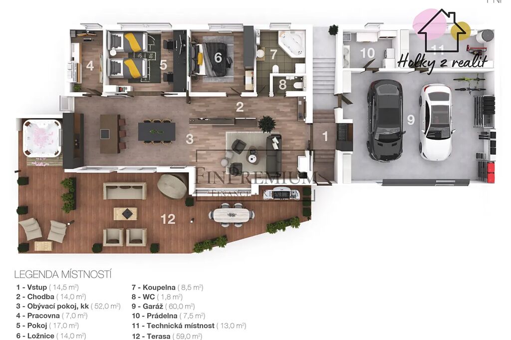 Součástí vily je wellness místnost s vířivkou, ideální pro odpočinek po náročném dni. Z hlavního obytného prostoru je vstup na rozlehlou terasu o velikosti 59 m², která zaručuje maximální soukromí a nabízí příjemné posezení.