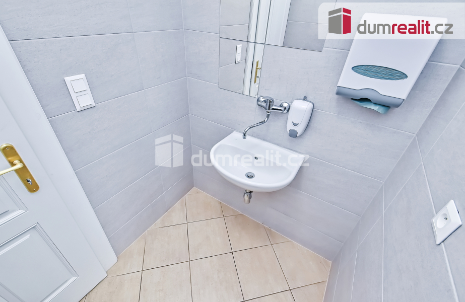 Před kancelářemi je společná chodba, kde se nachází pánské a dámské WC a společná kuchyňka, výtah a schodiště.