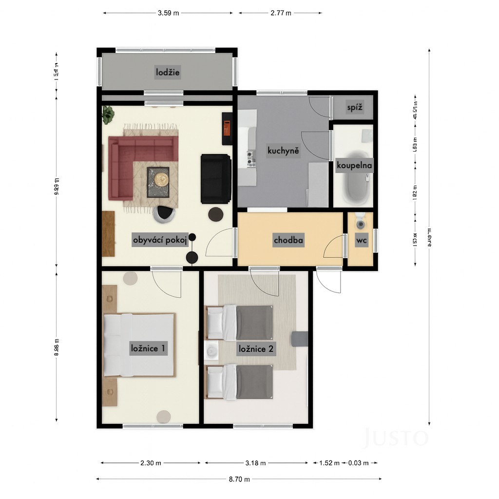 Orientace na více světových stran zajišťuje dostatek denního světla ve všech místnostech, což podtrhuje celkově světlý dojem bytu. Obývací pokoj je propojen s lodžií, která nabízí příjemné místo k odpočinku s výhledem do zahrady.