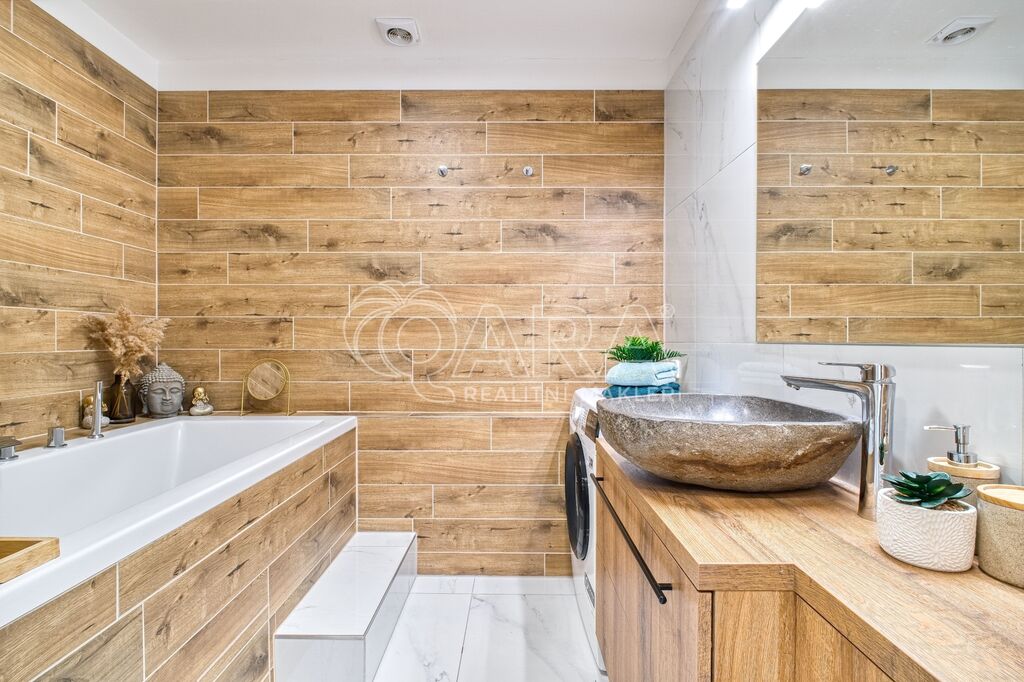 Najdete zde zděné jádro, prostornou koupelnu s vanou a umyvadlem z říčního kamene, kam se pohodlně vejde pračka i sušička.