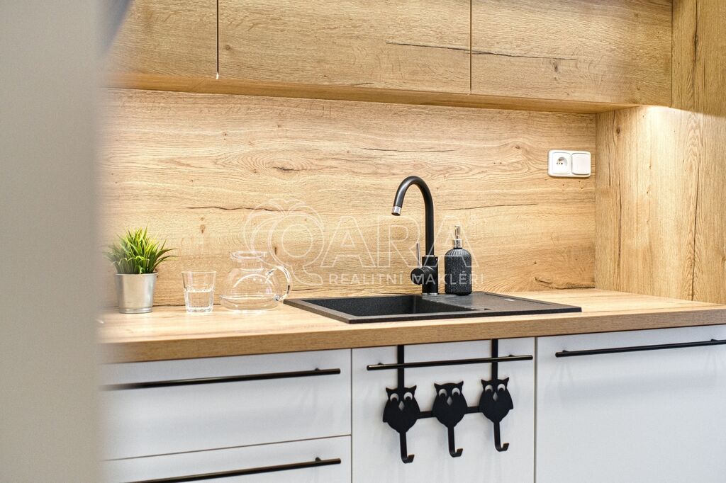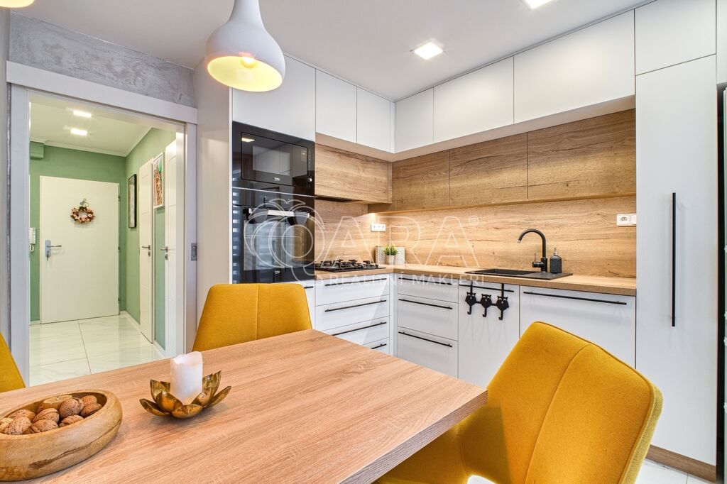 Kuchyň nabízí velké množství úložných prostorů, včetně chytře řešené části za jídelním stolem, a navíc z ní vstoupíte na zasklený balkon, ideální pro ranní kávu i zimní odpočinek.