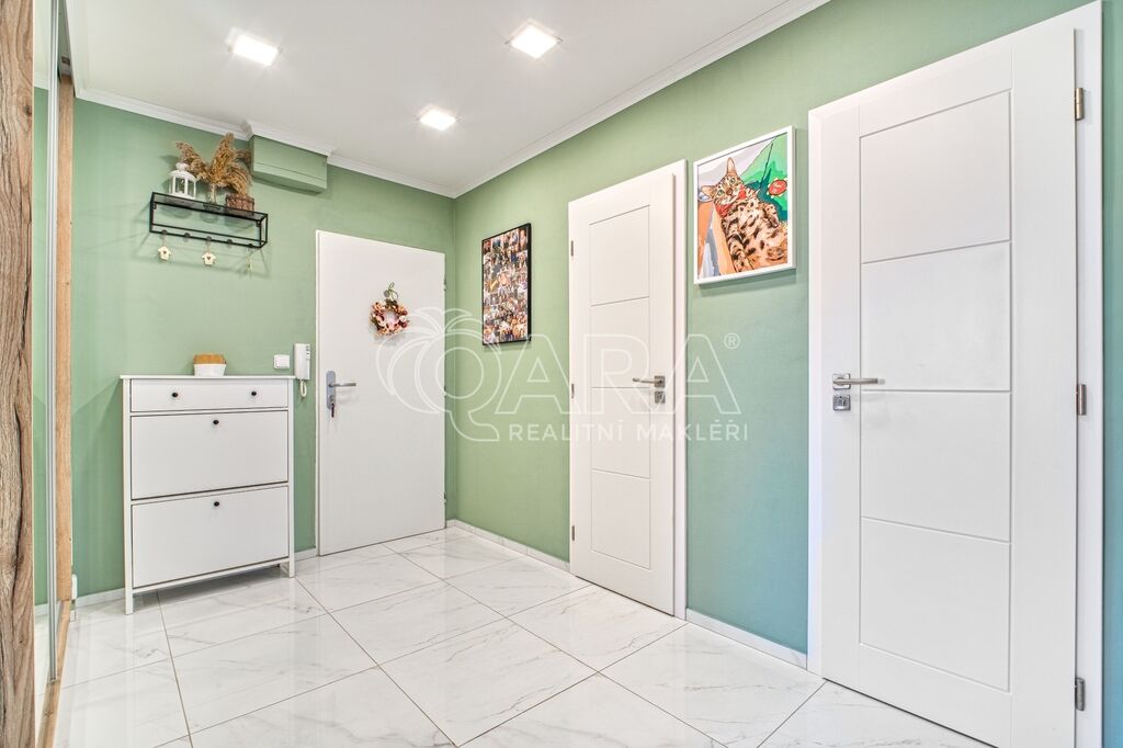 V prostorné předsíni vás potěší velká vestavná skříň a praktická dlažba, která plynule navazuje na kuchyň i koupelnu.