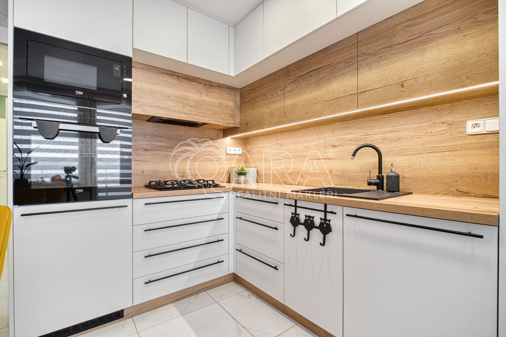 Kuchyně byla vyrobena na míru z kvalitních materiálů, s tlumicími prvky BLUM, vestavnou myčkou, troubou a mikrovlnkou.