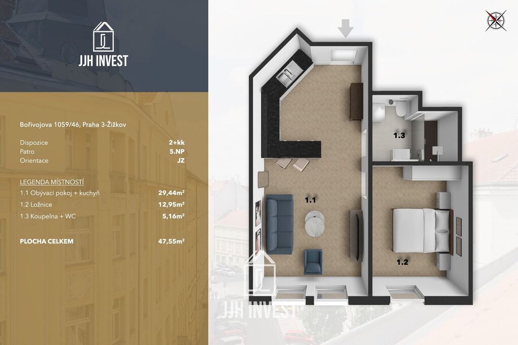Hledáte bydlení, které má styl, klid a skvělou dostupnost? Tento moderní byt 2+kk (48 m²) v ulici Bořivojova je ideální volbou! Jen pár kroků od ikonické Žižkovské věže a parků Parukářka a Riegrovy sady – perfektní pro relax, sport i večerní posezení.