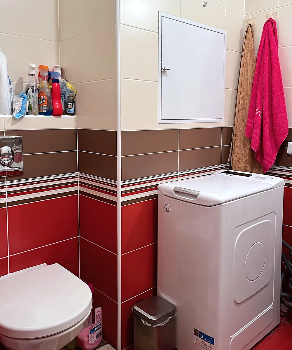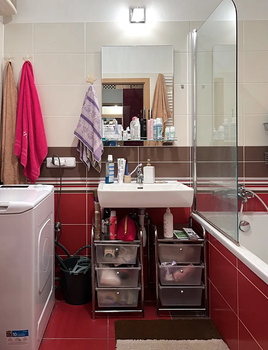 V koupelně je vana se sprchovou zástěnou, umyvadlo, WC a pračka.
