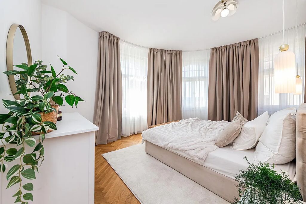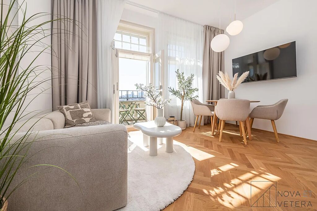 Byt je orientován na jih a západ, což zajišťuje dostatek denního světla a příjemnou atmosféru po celý den. Dominantním prostorem celého bytu je prostorný obývací pokoj se vstupem na terasu a kuchyňským koutem na míru, osazeným kvalitními spotřebiči MIELE, s pracovní deskou z přírodního kamene a důmyslným úložným systémem. Dvě samostatné ložnice jsou vybaveny designovým vestavěným nábytkem na míru, který maximálně využívá prostor. Hlavní ložnice s výhledem na panorama města nabízí místo pro odpočinek, které podtrhuje charakter celé nemovitosti. Koupelna je navržena v moderním, nadčasovém stylu a nabízí jak komfortní vanu, tak sprchový kout. K dispozici je také samostatná toaleta. Součástí bytu je sklep o ploše 2,23 m², který poskytuje praktické úložné zázemí.