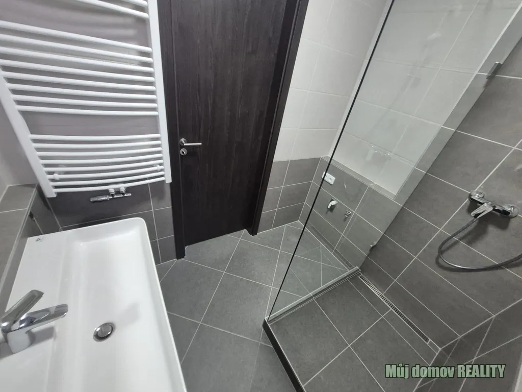 Moderní koupelna se sprchovým koutem a přípravou na pračku a sušičku