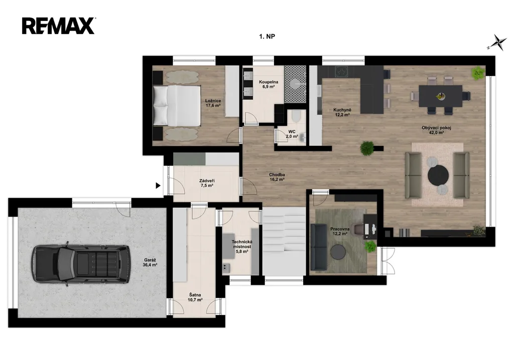 Výhodou je umístění domu v severní části pozemku, což zajistí, že jižní klidová zóna zůstane plně otevřena pro zahradu a venkovní relaxaci. Dům bude samostatně stojící, jednopodlažní, se sedlovou střechou a využitým podkrovím, což poskytuje ideální kombinaci komfortu a praktického využití prostoru.
