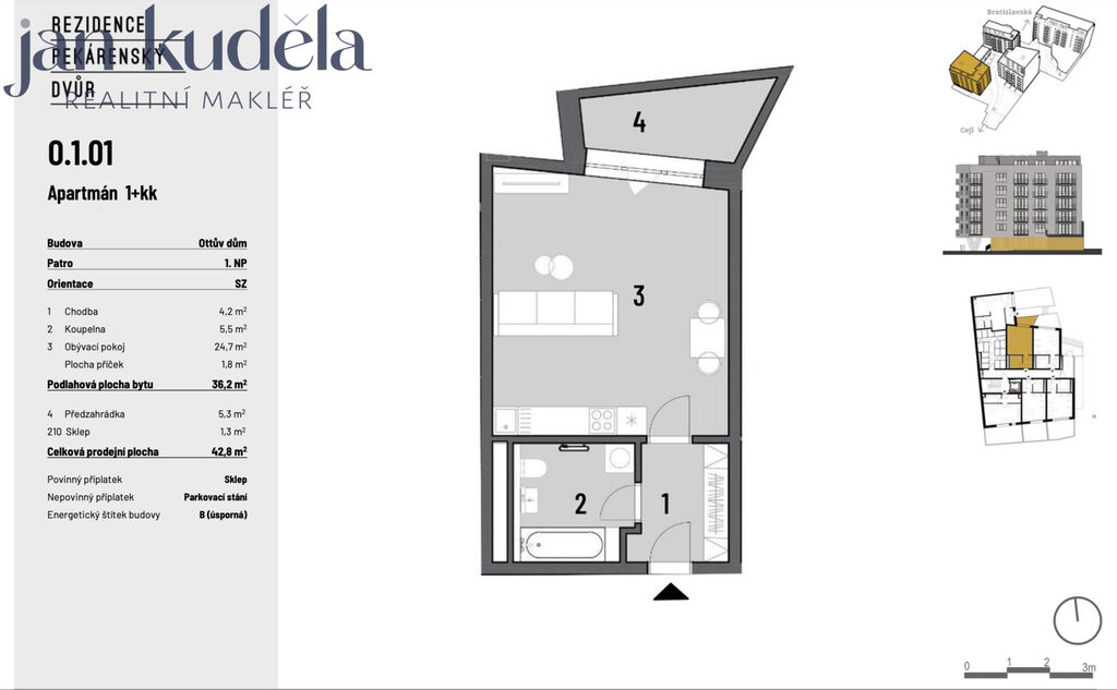 Nabízíme k pronájmu moderní byt o velikosti 1+kk (36,2 m²) s vlastní předzahrádkou a sklepní kójí, který se nachází ve vyhledávaném rezidenčním projektu Pekárenský dvůr na ulici Bratislavská. Byt je situován do klidného vnitrobloku a poskytuje soukromí i pohodlí v rámci nově vzniklé uzavřené rezidenční čtvrti.