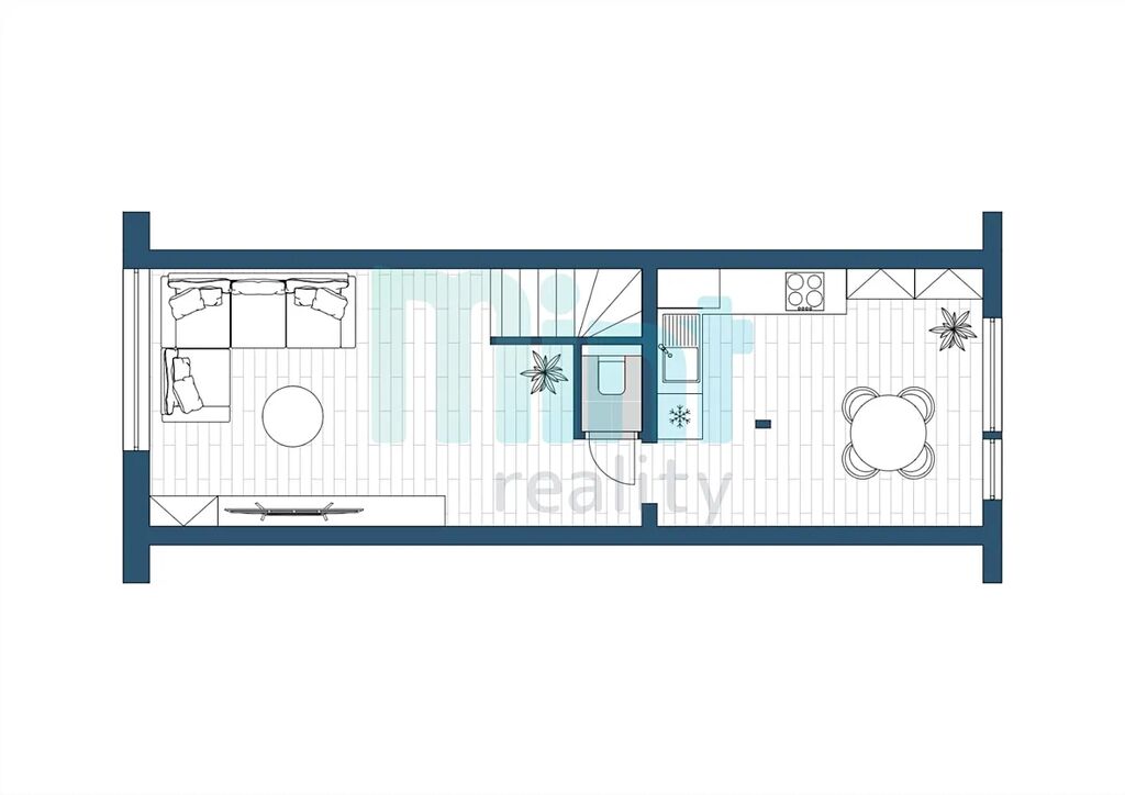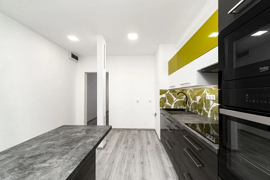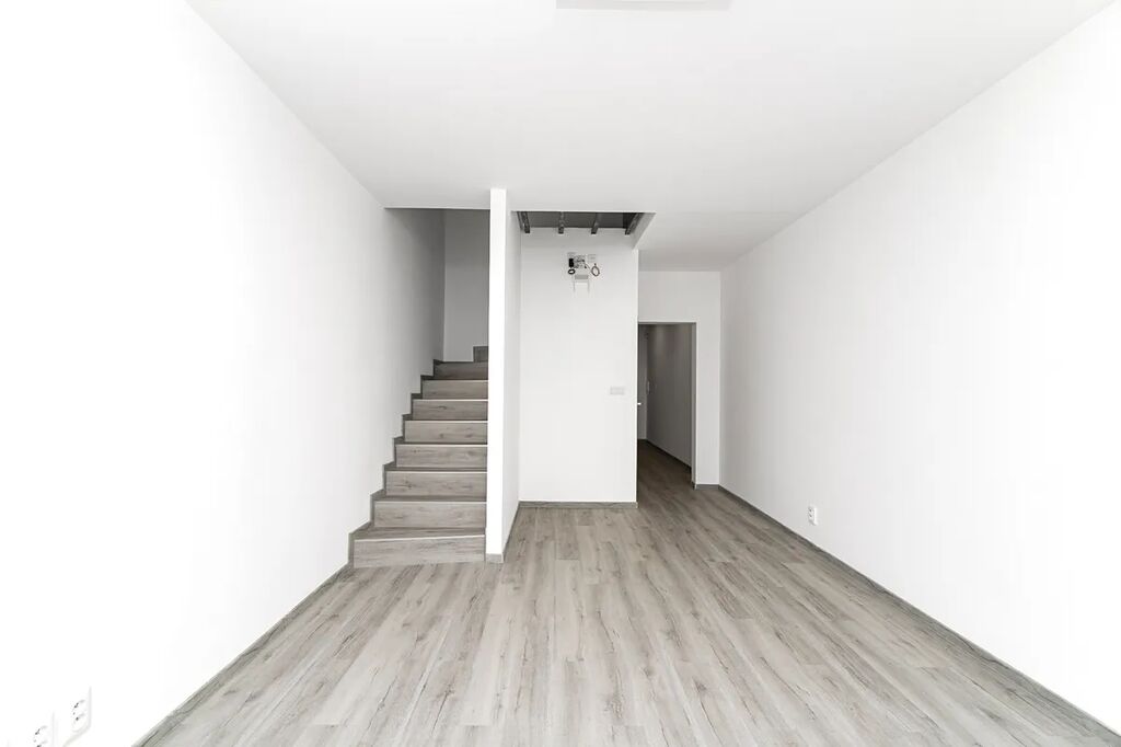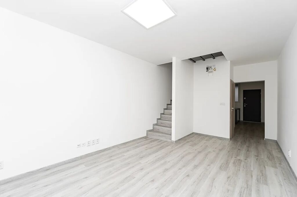 Byt je rozdělen do dvou úrovní. Po vstupu do bytu se ocitnete v útulné kuchyni, která je vybavena elektrickou indukční varnou deskou, vestavěnou elektrickou troubou a mikrovlnnou troubou. Disponuje také kuchyňským ostrůvkem, díky němu má kuchyň moderní vzhled a dostatek úložného místa. Kuchyň má také přípojky na myčku a pračku, což usnadňuje běžný provoz domácnosti. Ve spodní části bytu se nachází prostorný a slunný obývací pokoj, ideální pro odpočinek a rodinné posezení, a toaleta.