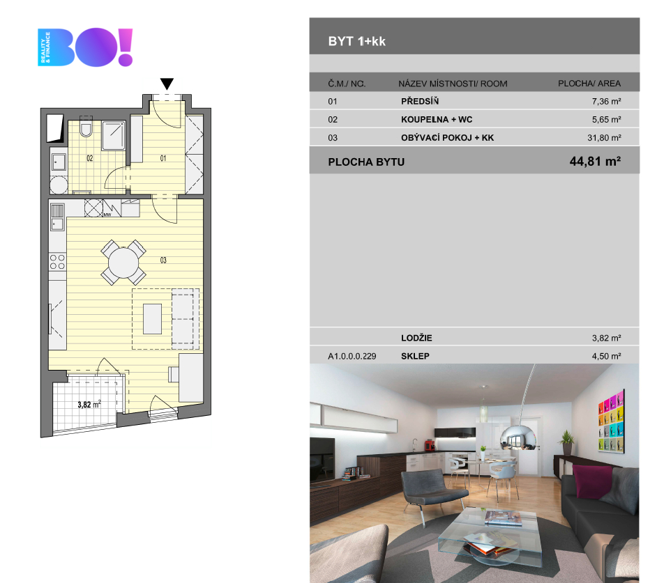 Byt o podlahové ploše 45 m² s lodžií 4 m² je šikovně dispozičně řešen tak, aby nabízel dostatek prostoru pro komfortní život.