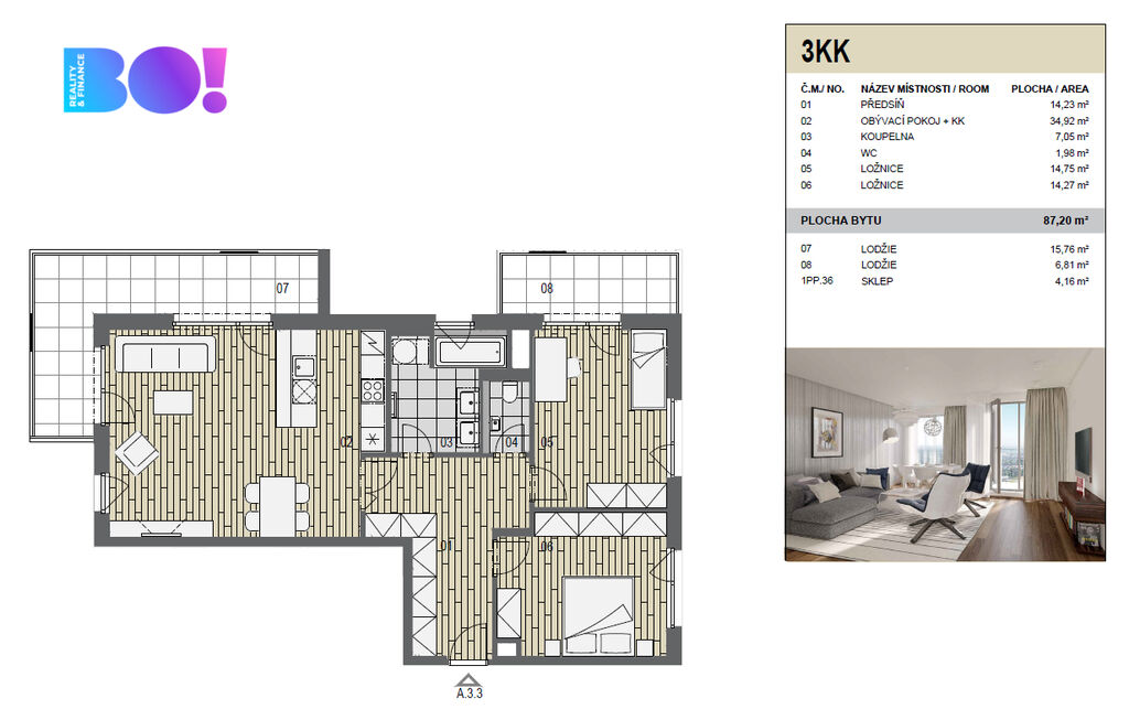Byt o podlahové ploše 87 m² s lodžií 23 m² je šikovně dispozičně řešen tak, aby nabízel dostatek prostoru pro komfortní život.