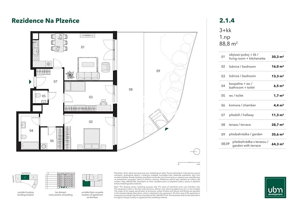 Exkluzivně nabízíme na prodej byt o dispozici 3+kk. Byt má podlahovou plochu 88,8m2, terasu o rozměru 28,7 m2 a předzahrádku velkou 35,6 m2. Vstup na terasu, která plynule navazuje na předzahrádku, je ze všech obytných místností, což celému bytu dodává příjemnou atmosféru a dostatek světla. Orientace do klidného vnitrobloku dodává jednotce dostatek soukromí i prostoru pro relaxaci jak uvnitř, tak venku na předzahrádce.