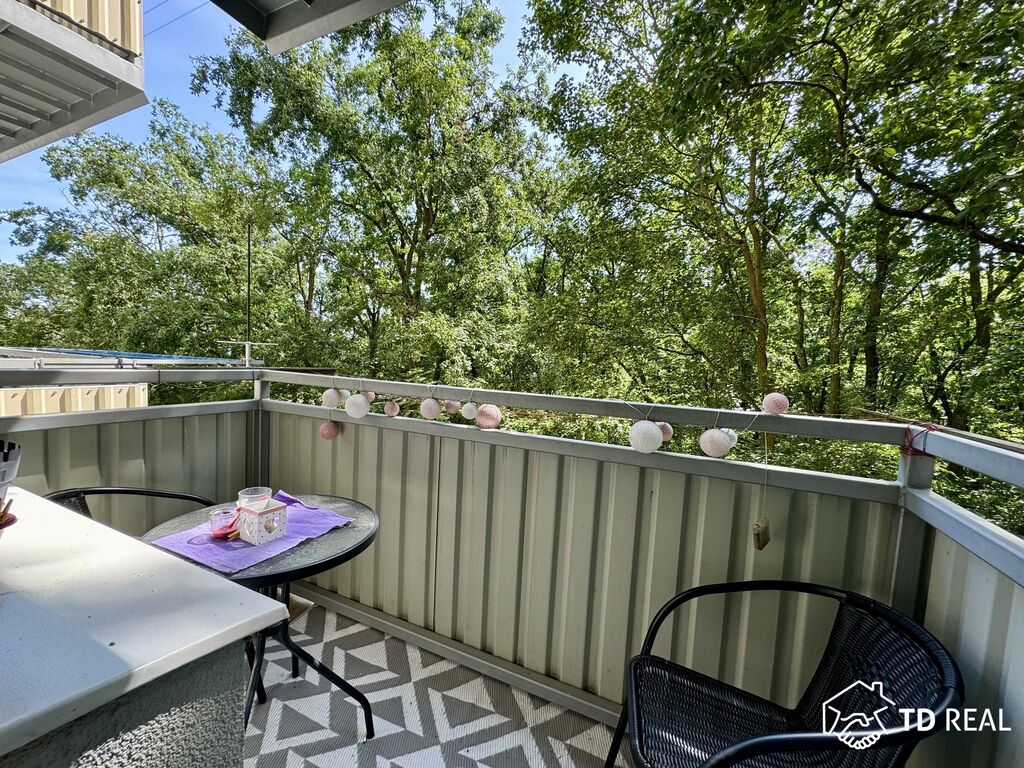 Dispozice: chodba se vstupy do všech místností bytu – pokoj (16,5 m2), ložnice (14,8m2), koupelna, samostatná toaleta (ale také i průchozí), kuchyně, spíž, velkou výhodou je šatna, dále je k dispozici sklepní kóje a balkon s výhledem do lesa.