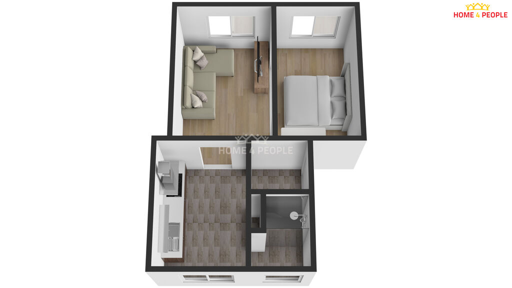 • obývací pokoj propojený s ložnicí (otevřený prostor, bez dveří)