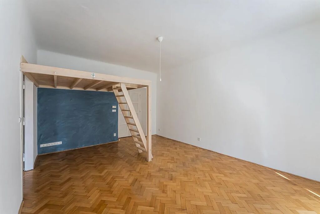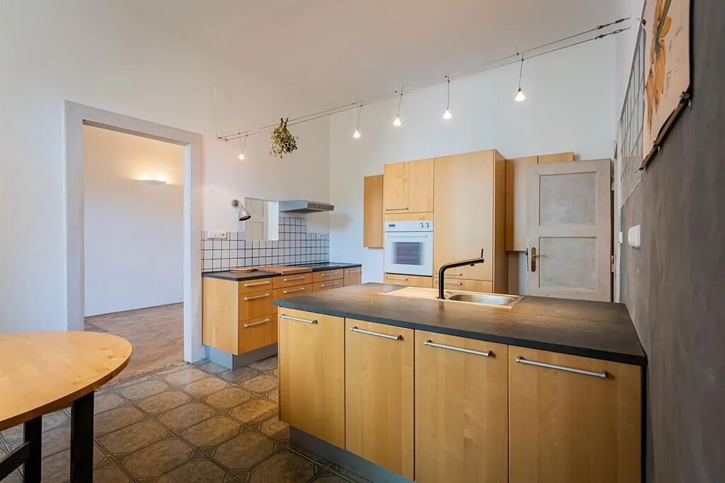 Interiér bytu je nezařízený, vybavení tvoří skříně, kuchyně se spotřebiči a jídelním stolem. Dispozici bytu tvoří dvě slunné místnosti s orientací do ulice na jihozápad a rozlehlá vstupní hala, malý dětský pokoj s vestavěným patrem a kuchyně, které jsou orientovány do krásného zeleného dvora na severovýchod, tímto směrem je i velký balkon (5,38 m2). Dále je v bytě samostatná toaleta a koupelna. Do ulice je orientován obývací pokoj s arkýřem ( vestavěné patro bude odstraněno) a druhý pokoj, kde je atiková, nahoře prosklená zeď (umožňující volný průchod denního světla), co rozděluje pokoj na ložnici a šatnu. Malý pokoj orientovaný do dvora lze využít jako dětský pokoj (má vestavěné spací patro) či jako pracovnu. Dále k bytu náleží sklep 12 m2.