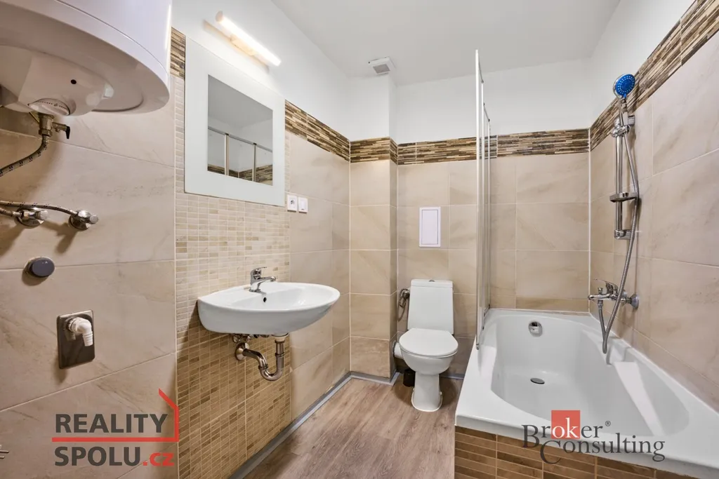 Z chodby se vchází také do koupelny vybavené vanou, toaletou a bojlerem, který zajišťuje ohřev teplé vody pro celý byt.