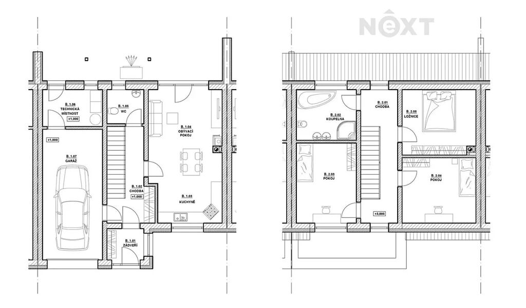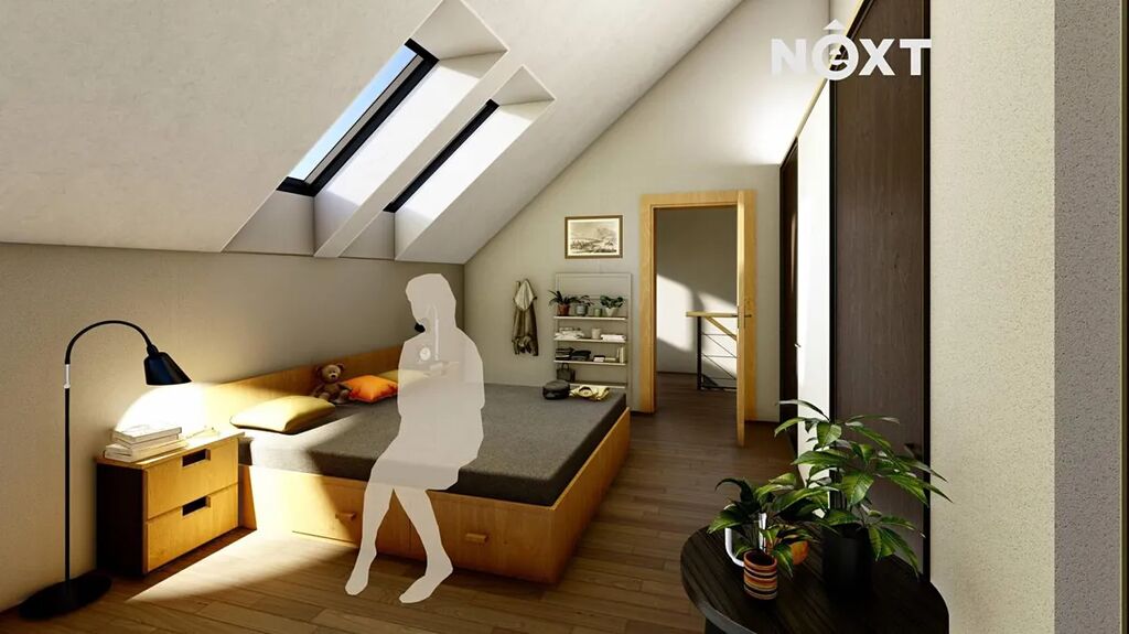 2. NP: Najdete zde tři prostorné ložnice a velkou koupelnu s WC, vanou, sprchou a dvojitým umyvadlem. Z chodby i jedné ložnice je vstup na venkovní balkon s výhledem do klidné části obce.